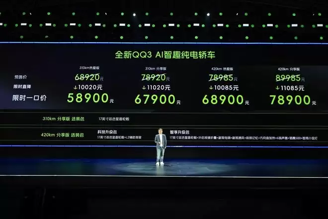 2026年3月30日,全新QQ3上市发布会在成都启幕。新车共发布四个版本,限时售价5 89万——7 89万,比预售价低了一万元,此前全新QQ3盲订订单超过6 1万,预售订单超4 3万。坐拥150万用