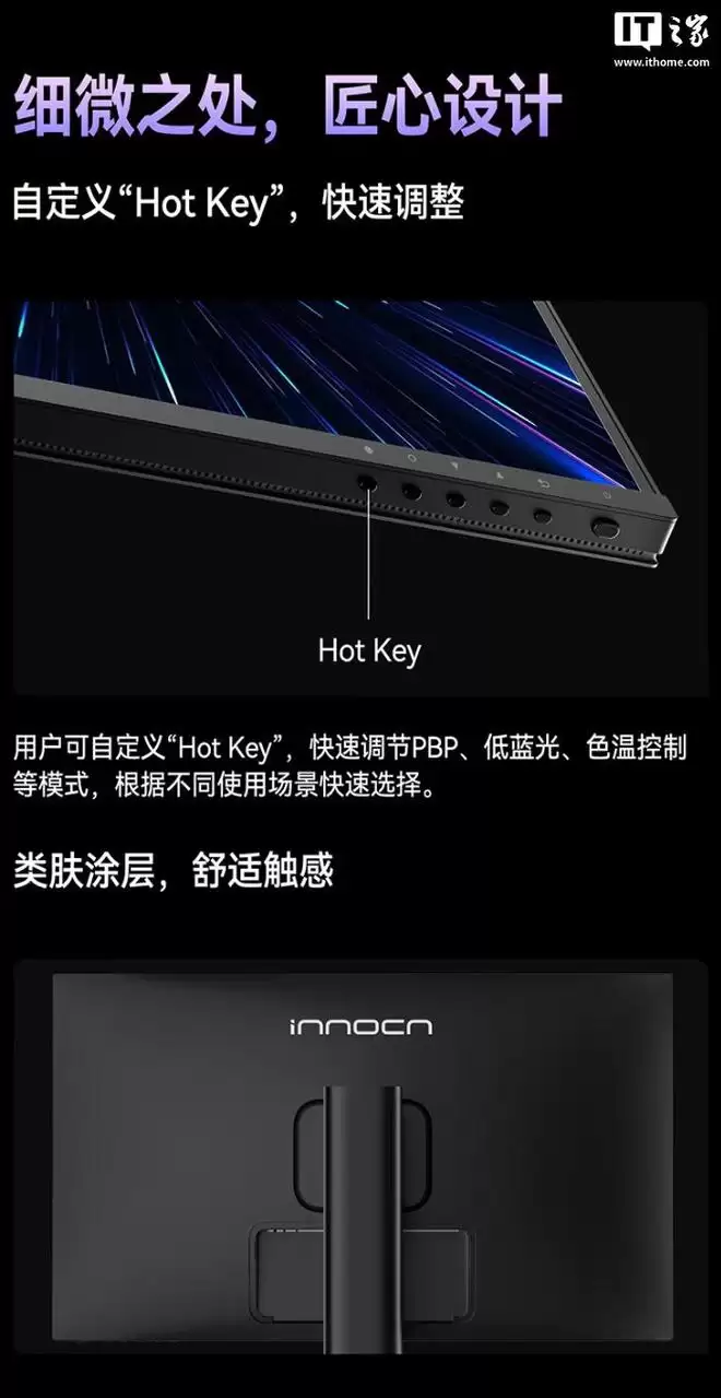 同时,这款显示器还具备出厂校色,ΔE<2,具备 Innocn 真实色彩模式,拥有 M.BOOK 模式,可匹配 MacBook 的色彩空间、色温,减少显示器与笔记本之间的色彩差异,支持六轴校色。