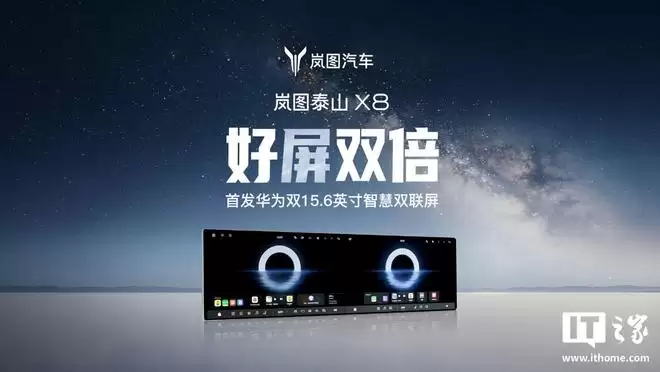 IT之家 3 月 31 日消息,岚图汽车最新今日宣布,岚图泰山 X8 将首发华为双 15 6 英寸智慧双联屏。据介绍,岚图泰山 X8 的华为双 15 6 英寸智慧双联屏搭载旗舰级硬件,支持高亮超清特