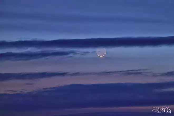 2025年4月1日,在黑龙江省富锦市拍摄的年度最大蛾眉月。(庚喜庆 摄)