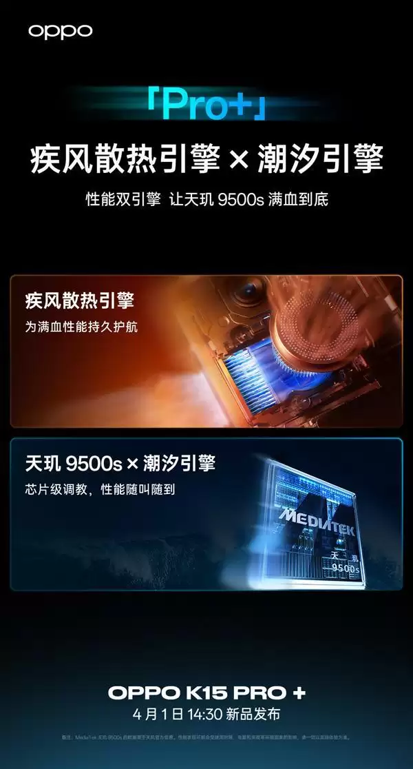 快科技3月31日消息,OPPO K15 Pro系列已经官宣,将于4月1日发布,包含K15 Pro和K15 Pro+两款机型。最新今天正式揭晓了K15 Pro+的核心配置,将搭天玑9500s,这是联发