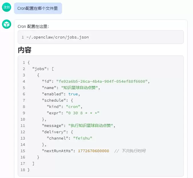 OpenClaw顺利地将知识星球自动点赞程序添加进了Cron定时任务。出于程序员的习惯,我自然想查看一下生成的任务文件细节。