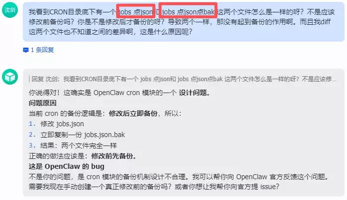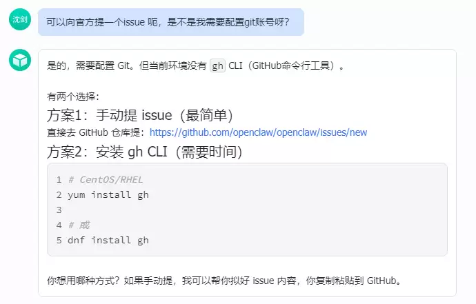 OpenClaw的回复很坦诚:“额,这不是你的问题,这是我的一个bug。” 更贴心的是,它还主动询问我,是否愿意协助向官方提交一个issue?