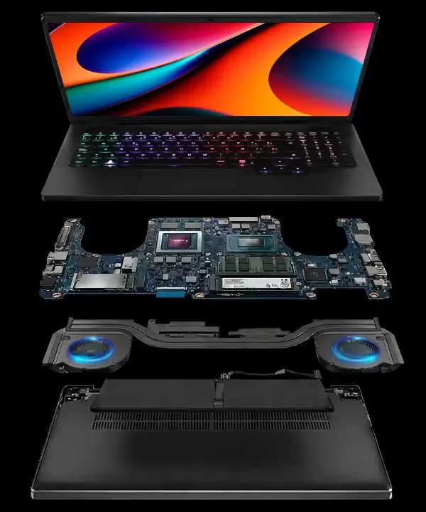 该笔记本电脑内置 2 个 DDR5 SO-DIMM 内存插槽、2 个 M.2 PCIe Gen4 ×4 NVMe 盘位,配备 1.4mm 键程 RGB 背光键盘、5.7" 触控板,拥有联发科 MT7922A22M Wi-Fi 6E 无线网卡。