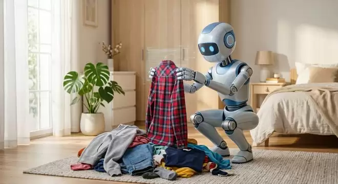 机器人站在衣柜前,急需找出那件藏在衣服堆里的蓝色衬衫。翻找间,刚叠好的衣服又散作一团。
