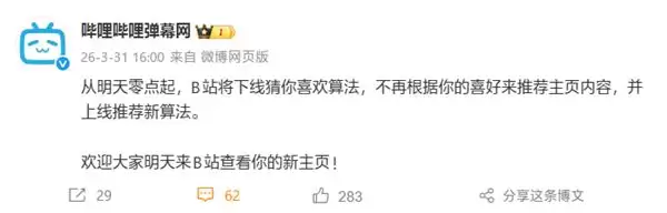快科技3月31日消息,B站最新今日发布公告,4月1日0时起正式下线"猜你喜欢"推荐算法,不再根据你的喜好来推荐主页内容,并上线推荐新算法。