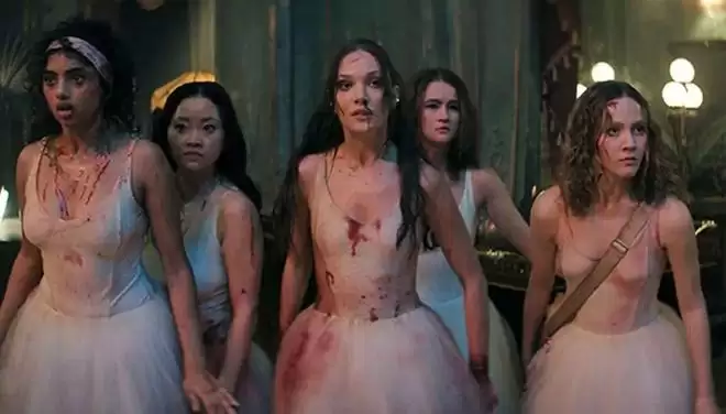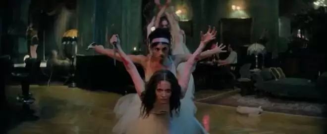 为了求生她们甚至在舞鞋的尖端绑上刀片,旋转、劈叉、高踢腿,每一个芭蕾动作都成了杀人手法,一支支诡美的双人舞接续上演。