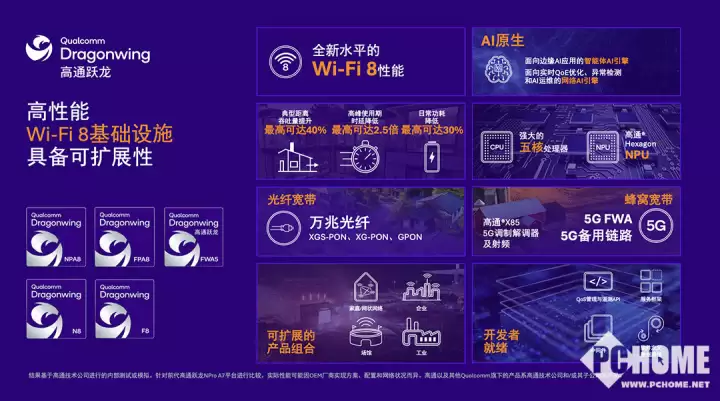 · 高通跃龙™ FiberPro A8 至尊版:在提供与NPro A8 至尊版相同的高可靠性Wi-Fi 8性能、边缘智能与平台级AI加速能力的基础上,新增了对10G光纤接入(PON)的支持。这无疑是运营商和OEM厂商打造统一、且面向光纤时代就绪的网关解决方案的理想选择。