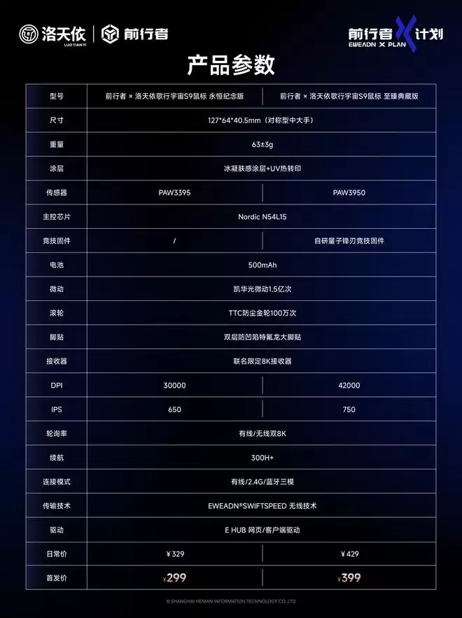 IT之家 3 月 31 日消息,前行者 EWEADN 今晚 20:00 即将正式开启洛天依联名歌行宇宙主题 S9 系列鼠标的预售,其中永恒纪念版首发价 299 元、至臻典藏版首发价 399 元。