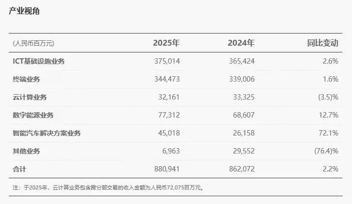 分产业来看,华为 ICT 基础设施业务 2025 年营收 3750.14 亿元同比增长 2.6%;终端业务营收 3444.73 亿元同比增长 1.6%;云计算业务 321.61 亿元同比降低 3.5%;数字能源业务 773.12 亿元同比增长 12.7%;智能汽车解决方案业务 450.18 亿元同比增长 72.1%。