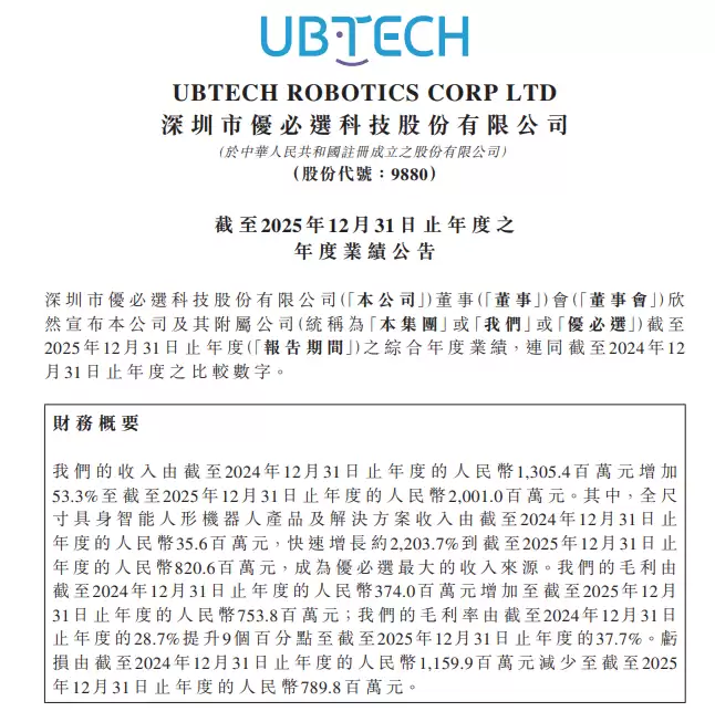 3月31日消息,3月31日,优必选(09880 HK)公告,截至2025年12月31日止年度,公司收入同比增长53 3%,达到20 01亿元人民币。其中,全尺寸具身智能人形机器人产品及解决方案收入增