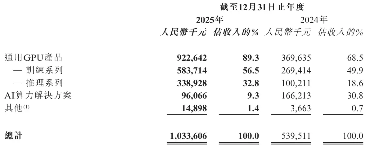 天数智芯2025年来自训练系列收入5.84亿,占比56.5%,较上年同期的2.69亿元增131.5%,主要由于因其性能提升,产品(尤其是天垓Gen 2)的客户需求增加;加强训练系列的销售工作;及加快销售天垓Gen 1库存。天数智芯2025年来自推理系列收入为3.39亿元,占比为32.8%,主要来自智铠系列收入。