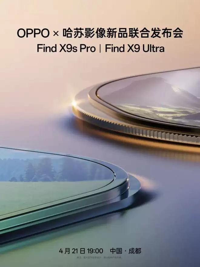 PChome 3月31日消息,OPPO × 哈苏影像新品联合发布会已经确定将在4月21日19:00于成都举办,OPPO Find X9 Ultra以及OPPO Find X9s Pro两部新机将在此