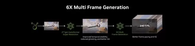 在此次更新中,最受关注的是面向 RTX 50 系列显卡用户的 6 倍多帧生成(6x Multi Frame Generation)功能。 英伟达表示,这一模式借助其第二代 Transformer AI 模型,在每渲染一帧原生画面的基础上,额外生成多达五帧新画面,将此前 DLSS 4 最多三帧的上限进一步提升,同时对操作响应性的影响“微乎其微”。