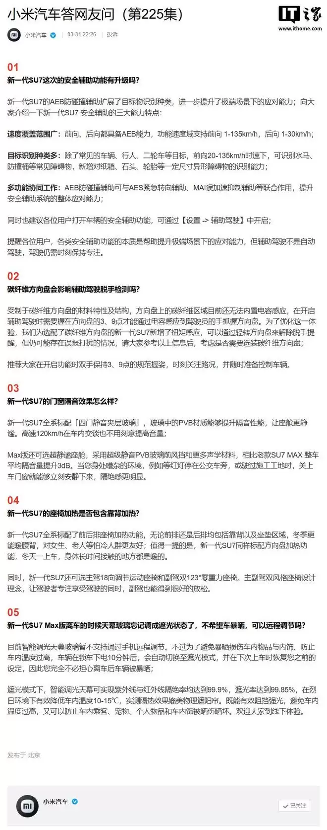 IT之家 3 月 31 日消息,小米汽车最新今日发布答网友问(第 225 集),针对新一代 SU7 这次的安全辅助功能是否有升级、碳纤维方向盘是否会影响辅助驾驶脱手检测等问题进行了解答。