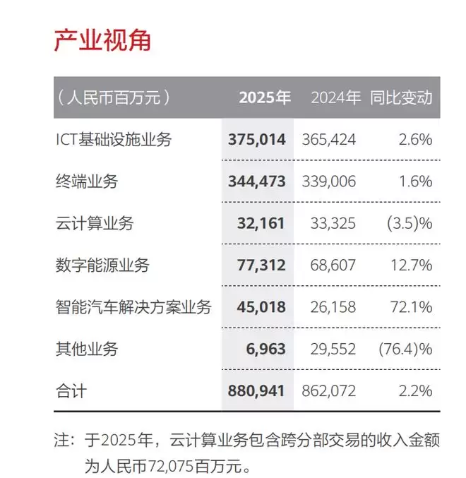 具体来看,ICT基础设施业务2025年稳健增长,收入3750.14亿元,同比增长2.6%,占总营收比例约43%。