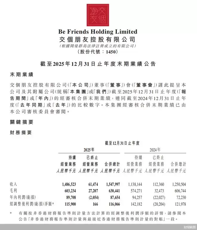 流量成本压力逐年递增。2025年,交个朋友涵盖直播电商等业务的新媒体服务业务板块的服务成本同比增长了56.6%,为8.8亿元。同时,该业务的毛利率由2024年约50.5%下降至年内的约40.6%。集团层面,交个朋友实现收入15.48亿元,同比增长23.79%,经调整后净利润则同比微降4.8%。