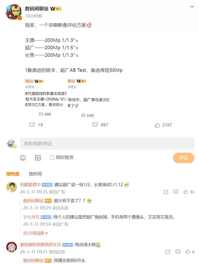 当然了,这套方案目前还在评估阶段,存在变数,而且博主在评论区透露,超广角正在AB测试,备选常规5000万像素方案。
