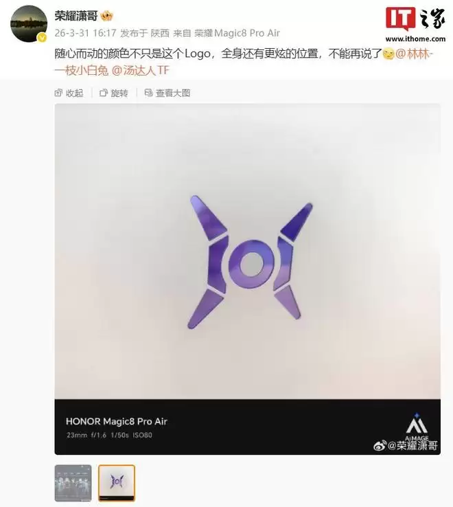 @荣耀潇哥 还分享了另一张实拍图,展示了游戏本 A 面的发光 LOGO 正散发紫色光芒。由此来看,荣耀 WIN 游戏本首曝的可发光 LOGO 支持色彩切换,可与“猎人武器库”进行灯效主题的联动。