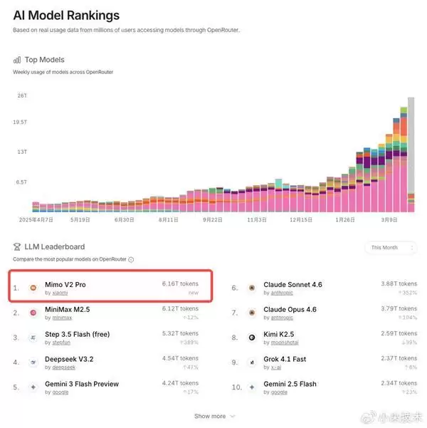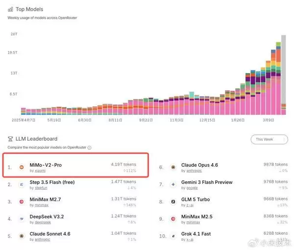 在OpenRouter平台,MiMo-V2-Pro表现尤为突出,上线首周便成为平台首个周token消耗量超3万亿的模型,此次更是拿下日榜、周榜、月榜全维度第一。
