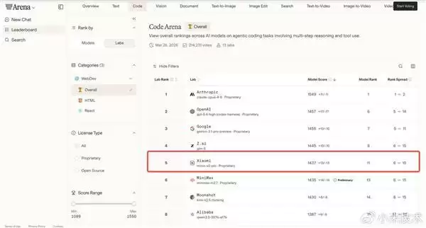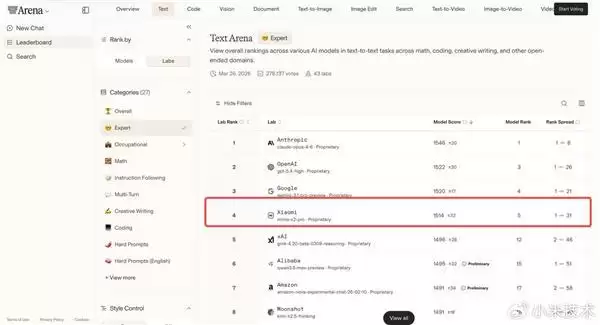 在衡量实验室综合研发实力的Lab Rank(实验室排名)维度,小米拿下Text Arena(Arena Expert)全球第四、Code Arena全球第五的优异成绩。