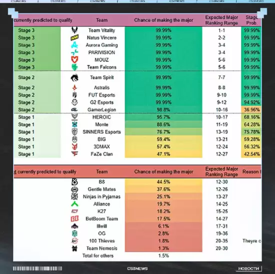 值得一提的是,本来进入Major几率为0%的100 Thieves,因为近期的优异表现将几率提升至1.8%。虽然依旧希望渺茫,但总是在进步。