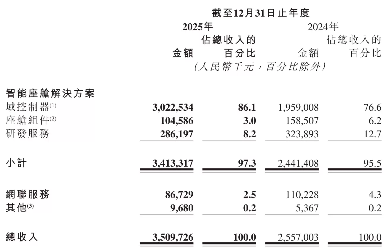 据财报披露,2025年博泰车联智能座舱域控制器的交付量达到130万台,较2024年增长超过40%。这一增长直接推动了公司智能座舱解决方案收入的攀升,该板块全年收入达34.13亿元,占公司总营收的97.3%。其中,域控制器收入为30.22亿元,占比86.1%;座舱组件收入为1.05亿元,占比3%;研发服务收入为2.86亿元,占比8.2%。
