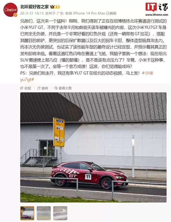 10、小米 YU7 GT 无伪装实车曝光:红色外观 + GT 拉花、配巨大刹车卡钳,正在纽北赛道进行测试