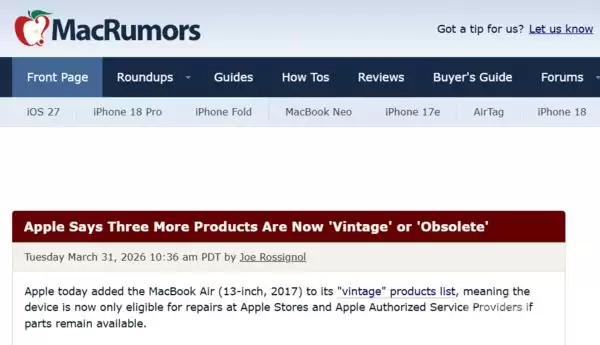2017年款MacBook Air被列入苹果复古与过时产品名录