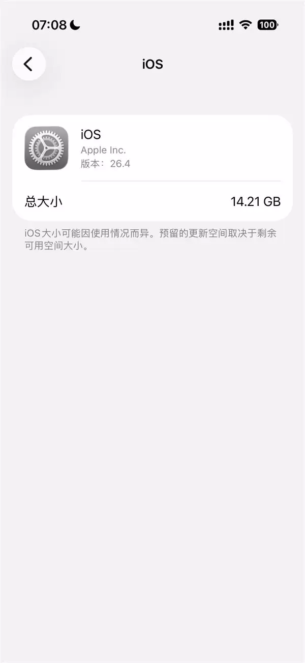 同时,系统存储信息也出现变化,此前显示苹果智能占用约7.33GB空间,如今已不再显示,仅剩iOS本体约14.21GB,这也意味着相关AI能力已被彻底移除。