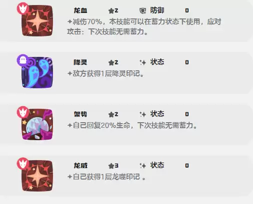 输出体系以“坟场搏击”为核心爆发技,基础威力180,属高耗能高回报型技能,需结合敌方能量状态择机释放;配合“架势”类技能提供的回血与免蓄力效果,可完全规避传统蓄力短板,实现无缝连招。另一主力技能“龙之利爪”拥有130物攻威力并附带50%吸血效果,适用于持久消耗战。辅助维度上,“龙血”与“虚化”均可提供70%减伤,“锐利眼神”则可使目标双防下降120%,形成高效压制链。