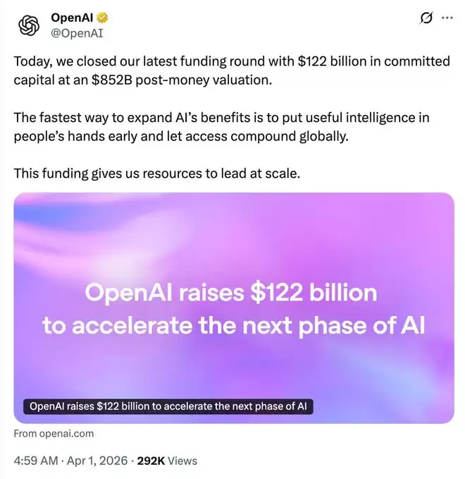 当地时间3月31日,OpenAI宣布完成最新一轮融资,募集资金达1220亿美元,投后估值达8520亿美元。 微信编辑 | 七三