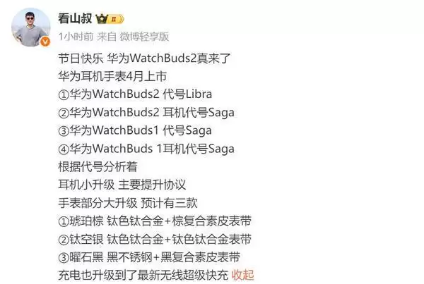 据爆料信息,华为WatchBuds2代号为“Libra”,内置耳机代号“Saga”。功能升级方面,耳机部分聚焦协议优化,预计将提升连接稳定性与兼容性;手表部分则迎来重大革新,除硬件性能提升外,还将推出三款配色版本:琥珀棕采用钛合金表身搭配棕复合素皮表带,钛空银为全钛合金设计,曜石黑则结合黑不锈钢与黑复合素皮。此外,WatchBuds2将支持最新无线超级快充技术,充电效率显著提升。
