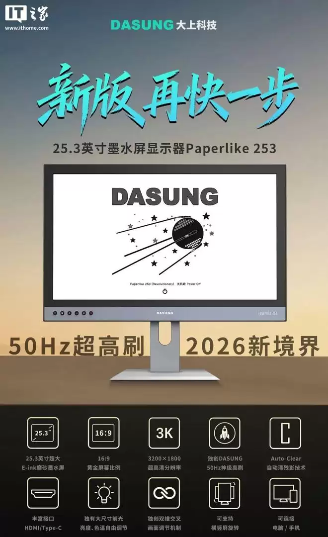 此外,大上科技推出新款 25.3 英寸黑白墨水屏显示器 —— Paperlike 253(50Hz 超高刷版)。