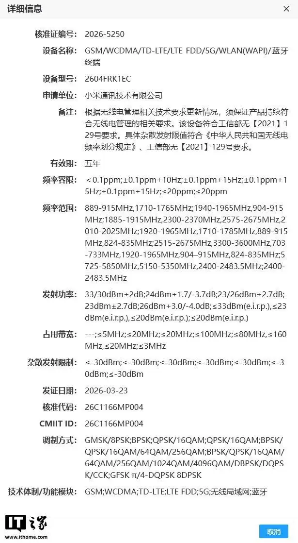 IT之家 4 月 1 日消息,CCC 认证 显示,小米一款 5G 手机于 3 月 31 日入网,型号为 2604FRK1EC,支持 100W 闪充。