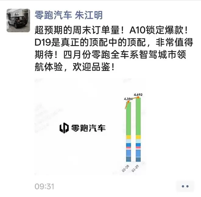 3月30日,零跑汽车(09863 HK)创始人、董事长兼CEO朱江明在社交平台发出最新销量战报:超预期的周末订单量!A10锁定爆款!D19是真正顶配中的顶配,非常值得期待!四月份零跑全车系智驾城市领