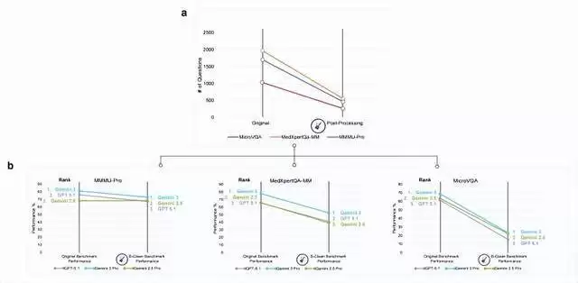 B-Clean的完整流程就是这样:把视觉基准测试中的图像全部去掉,让各个模型进行理解,如果模型在没有图的情况下还能答对,就说明这些题对模型的图像理解能力无效。把那些无效题删掉,最后剩下的,所有模型在没图的情况下都答不对的题目,才能真正考验模型的“视觉能力”。