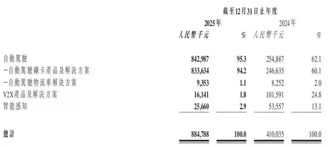 乘行业高速发展东风,2025年希迪智驾高质量兑现了成长预期。报告期内,公司的自动驾驶业务贡献收入8.43亿元,占公司总收入的比重达95.3%;同时,该业务也是希迪智驾增长的主引擎,同比口径下收入增幅高达2.3倍。