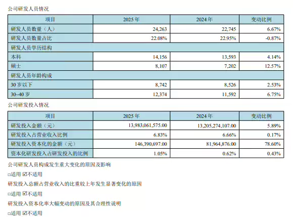 京东方还持续保持高强度投入,2025 年研发投入达 139.83 亿元,占营业收入比例为 6.83%。