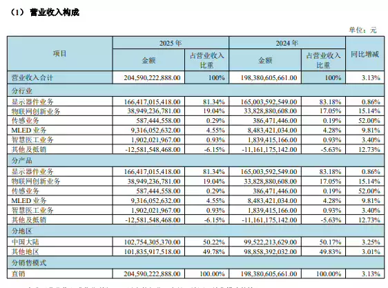 物联网创新业务表现亮眼,营收约 389.49 亿元,同比增长 15.14%,成为推动公司增长的重要动力。此外,传感业务、MLED 业务和智慧医工业务分别实现营收约 5.87 亿元、93.16 亿元和 19.02 亿元,同比增幅分别达到 52.00%、9.81% 和 3.40%,各细分赛道均呈现良好发展态势。