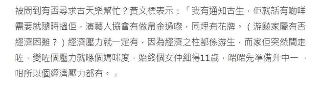 谈到跟游飚的难忘事,黄文标表示当年在TVB时游飚知道他要“劏车”,就提出借钱给他买车,因为担心对方要用钱时周转不来而婉拒好意,又大赞对方好有义气,有人出声就会帮忙。问到可知游飚有否借钱收不到,他坦言不清楚。谈到是否有找演艺人协会主席古天乐帮忙,他表示有通知古天乐,对方指有需要就出声,演艺人协会也有做帛金。