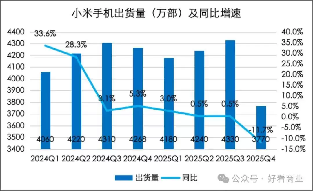 与汽车业务的高歌猛进形成鲜明对比的是,小米手机业务正陷入持续萎缩的困境。2025年,手机×AIoT板块收入3512亿元,同比增长仅5.4%,其中手机业务连续三个季度同比下滑。全球出货量1.652亿台,同比减少2%,海外硬件收入下滑5%。印度市场从年出货量超4000万台萎缩至1970万台,同比减少26%;欧洲市场虽以2180万部出货量成为海外最大市场,但也出现1%的降幅。毛利率方面,手机业务第四季度创下8.3%的新低,全年毛利率10.9%,显著低于2024年的12.6%。存储芯片价格暴涨、中低端机型占比过高、促销让利等因素,共同挤压了利润空间。
