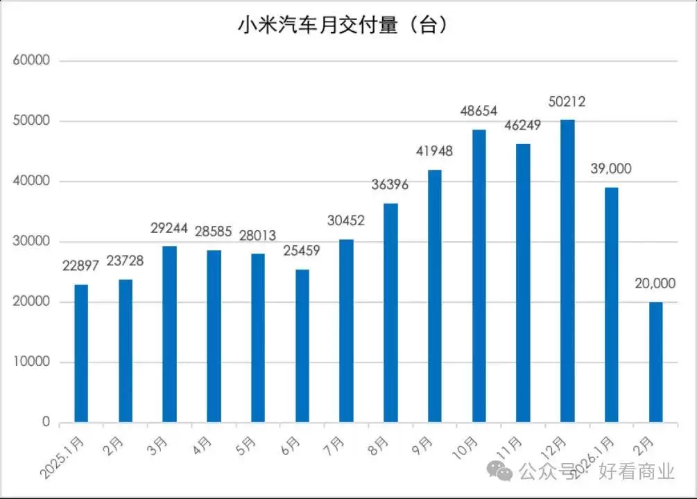 2026年第一季度尚未结束,小米汽车已感受到前所未有的交付压力。年初设定的55万辆年度目标,前两个月仅完成6万余辆,剩余9个月需平均每月交付5.18万辆才能达标。这一数字背后,是初代SU7停产后主力车型YU7交付量下滑的现实——前两个月分别交付3.9万和2万辆,而3月初周订单已回落至4000辆左右,月订单不足2万。