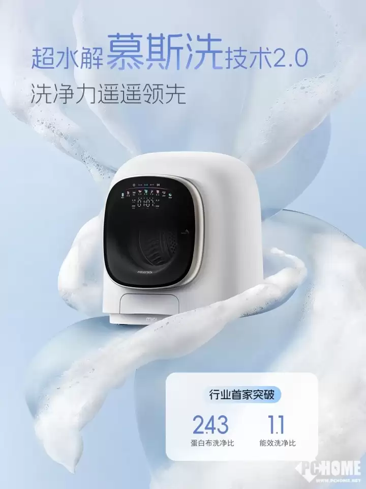 这套系统彻底摆脱了传统迷你洗衣机依赖机械摩擦或单一高温清洗的旧有模式。它通过创新的技术手段,在洗涤过程中能够达到99.99%的广谱除菌率,同时兼顾强力去渍与保护衣物色彩。结合升级的“慕斯洗2.0”技术,生成的纳米级绵密泡沫具有超强渗透力,能温和包裹衣物纤维并深入瓦解污渍。最终,它实现了行业领先的1.1洗净比,而针对蛋白布等顽固污渍的测试,其洗净比更是高达2.43。这确保了产品不仅拥有顶级的清洁能力,也为后续的衣物护理奠定了坚实的健康基础。