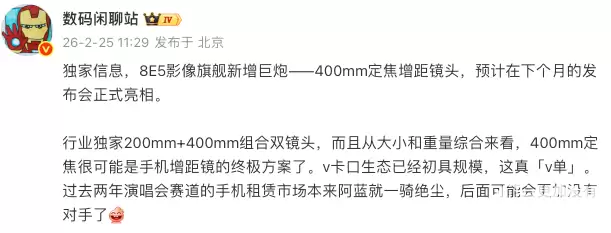 那么,vivo X300 Ultra在影像配置上有哪些突出亮点?根据行业内部消息,其影像系统可谓“顶级堆料”。据悉,它将全球首发搭载索尼LYT-901 2亿像素大底主摄,并配备一枚同样达到2亿像素的潜望式长焦镜头,辅以行业领先的超广角镜头,实现从超广角到超长焦的全焦段影像能力大幅提升。更值得关注的是,新机有望搭载业内首创的200mm与400mm双定焦增距镜组合。其中,400mm超长焦段的加入,很可能成为智能手机长焦摄影领域一次里程碑式的突破。在“双2亿像素主摄”与“双定焦增距系统”的协同工作下,X300 Ultra有望在远距离拍摄场景,如舞台演出、体育赛事等方面实现画质新高度,进一步巩固其“演唱会摄影神器”的市场口碑。