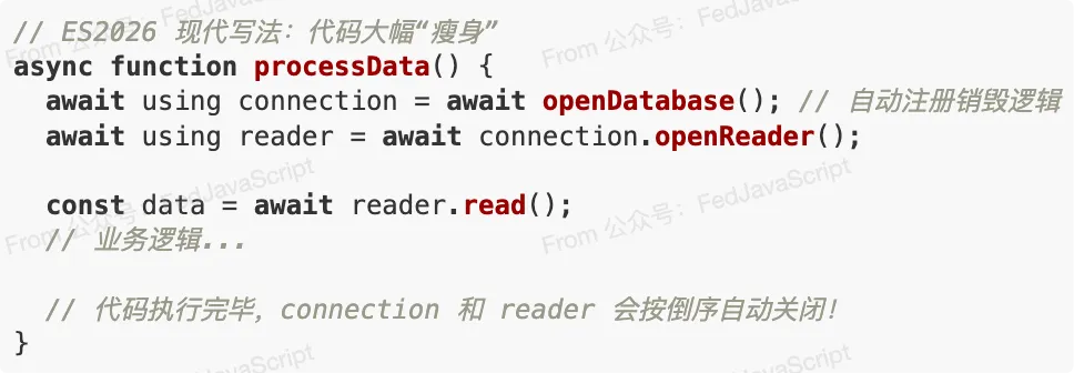 // 传统写法:逻辑被包裹在沉重的清理模版中async function processData() { const connection = await openDatabase(); try { const reader = await connection.openReader(); try { const data = await reader.read(); // 业务逻辑... } finally { // 必须手动关闭 reader await reader.close(); } } finally { // 必须手动关闭 connection await connection.close(); }}