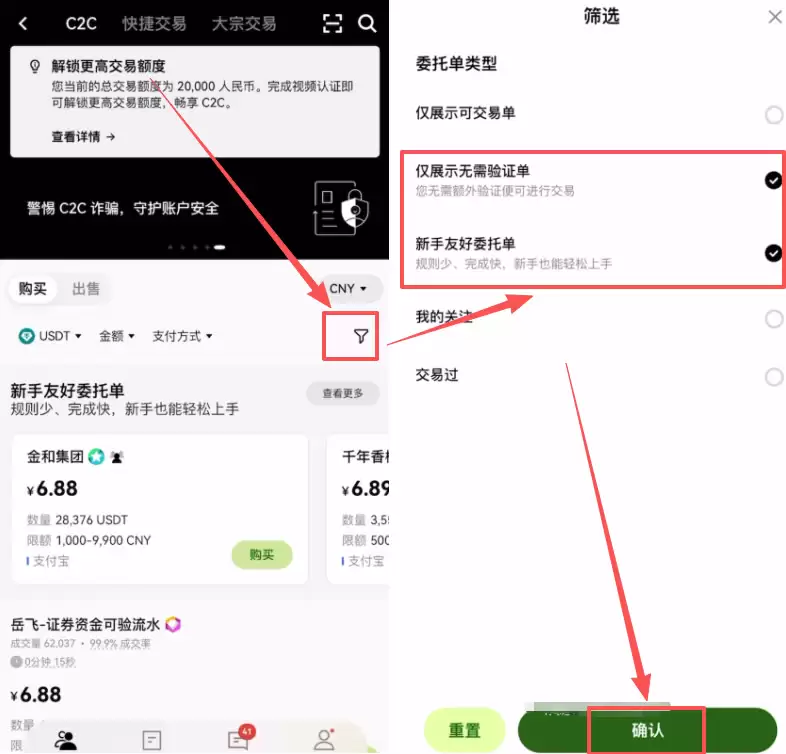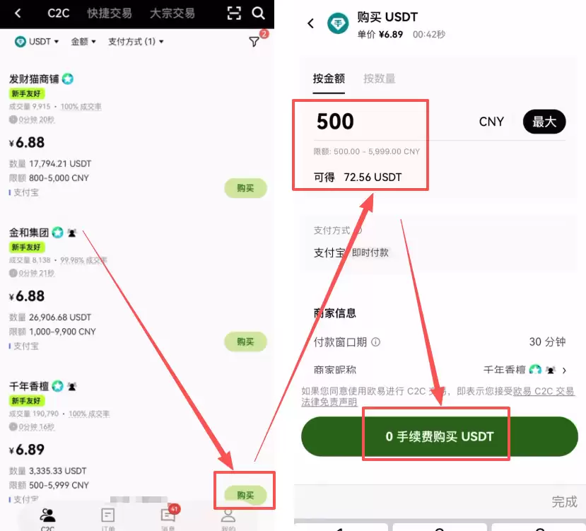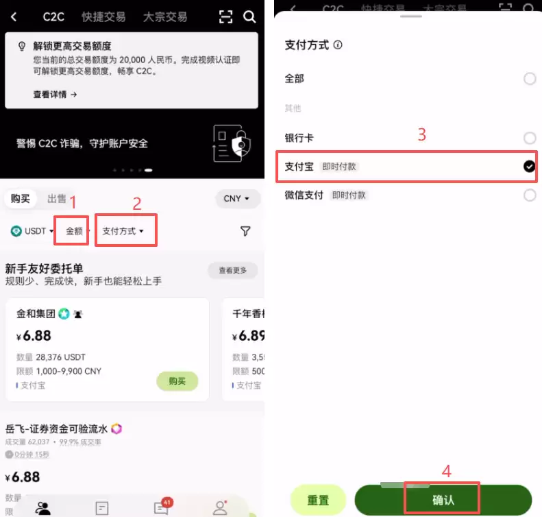 第五步:C2C购买第一笔加密货币(以USDT为例)