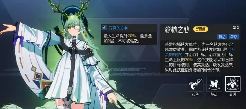 善雅的终极技能“森林之心的祝福”是一个足以改变战局的战略级技能。它可以为全体队友施加一个名为“万灵的庇护”的增益状态,并立即提供一次群体治疗,治疗量等同于善雅最大生命值的16%——其数值约等于4级“凝露”技能的基准效果。简单来说,在战斗开局或关键时刻释放此大招,能够瞬间为队伍带来远超常规治疗的应急恢复,迅速稳住团队血线。