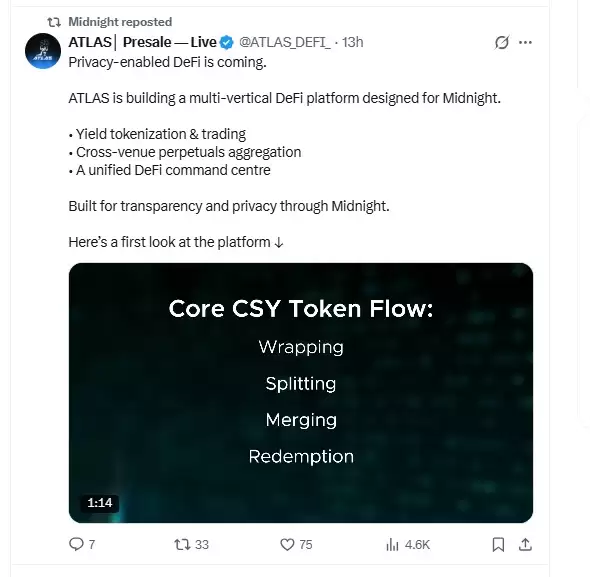ATLAS DeFi在X平台发布重要公告,透露正在为该网络构建以隐私为中心的DeFi平台。