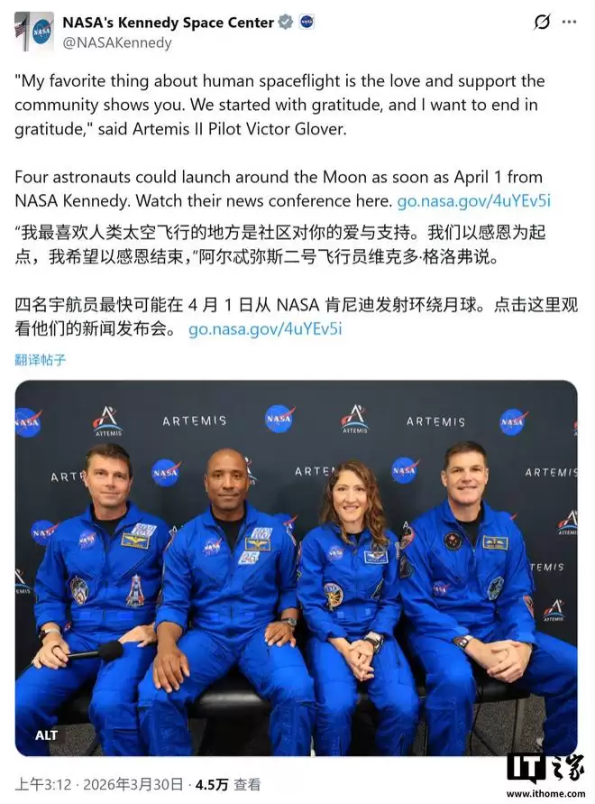 美国宇航局计划于美国东部时间 4 月 1 日下午 6 时 24 分(IT之家注:北京时间 4 月 2 日早上 6 时 24 分)起的两小时窗口内,发射“阿耳忒弥斯 2 号”任务,三名美国宇航员与一名加拿大宇航员开启为期 10 天的环月飞行并返回地球。